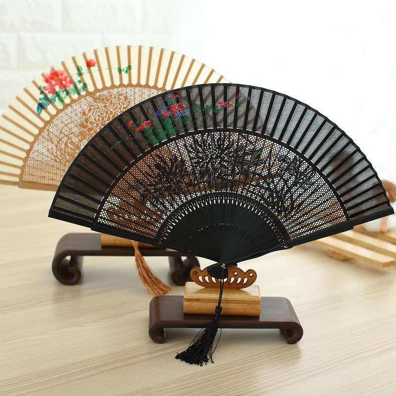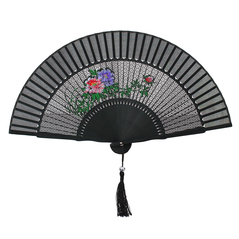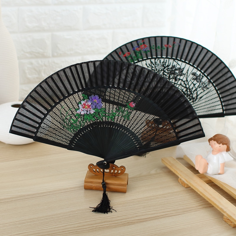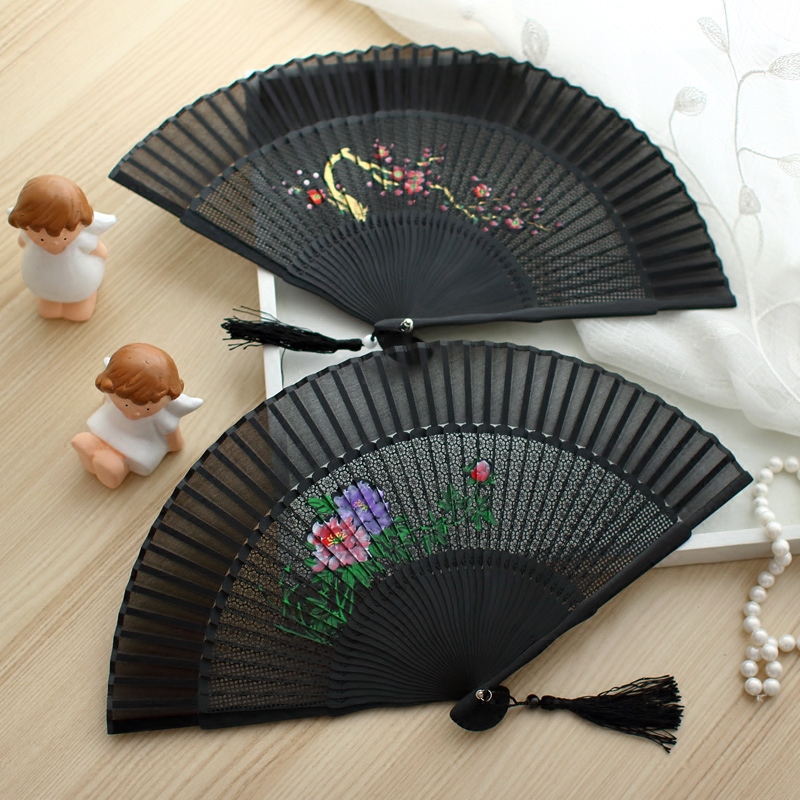 (Miao Yan) silk hand-painted Chinese style folding fan female fan ancient style gift fan bamboo carving black craft fan