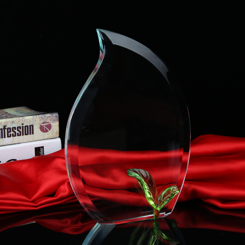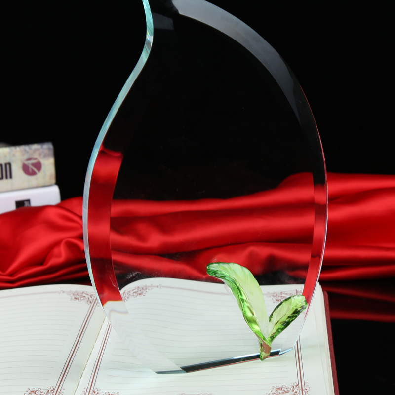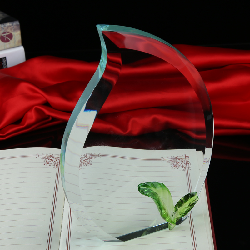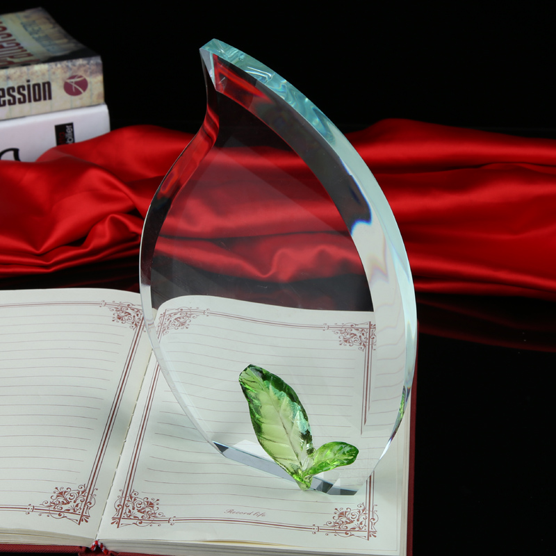 Crystal Trophy Custom Glass Green Leaf Creative Water Drop Trophy Company Competition Awards Commemorative Gift Lettering