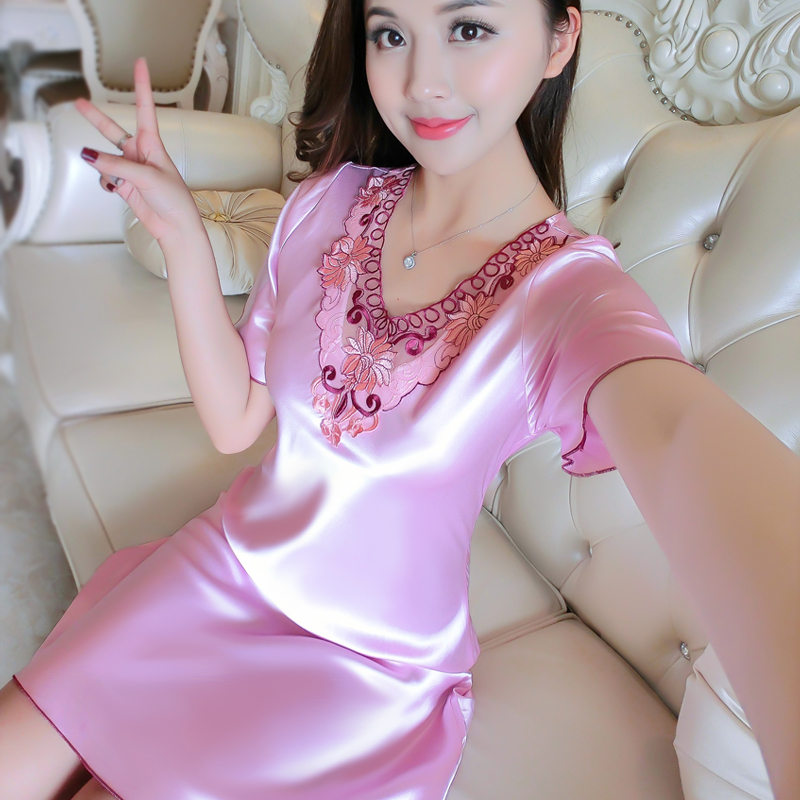 Ice Silk Sleeping Skirt Woman Summer Short Sleeve Sexy Sleepwear Lady Summer Princess Lace Silk Sweet Beauty Outside Wearing Pyjamas Dress