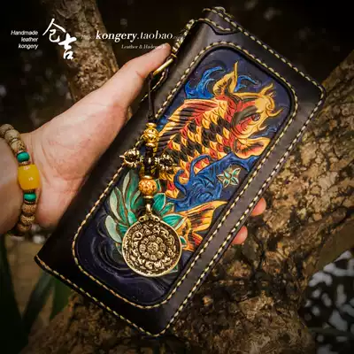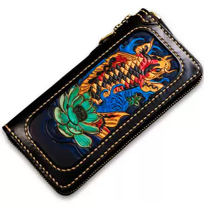 Kurayoshi handmade wallet men's and women's long zipper Chinese style retro leather carving lucky fish leather vertical hand grab bag