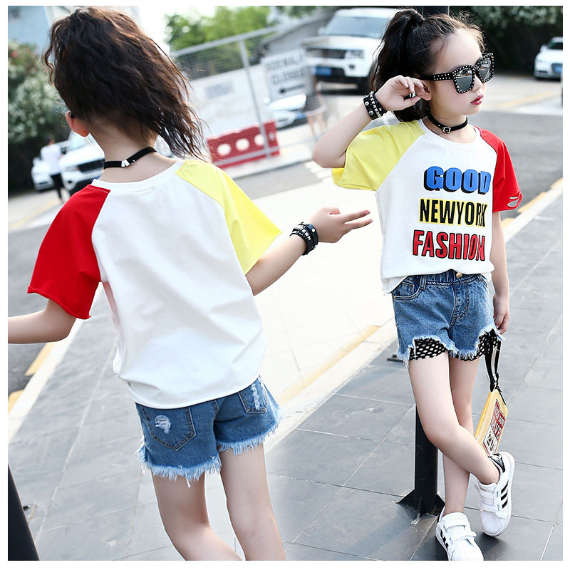 Red blue black pink sky blue red striped 84T shirt denim shorts black striped 84T shirt denim shorts red sleeves goodt T-shirt mesh yarn denim shorts blue sleeves goo