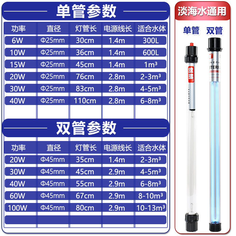 6W long 30cm single tube 10W long 36cm single tube 15W long 45cm single tube 20W long 76cm single tube 30W long 83cm self-sinking 40W
