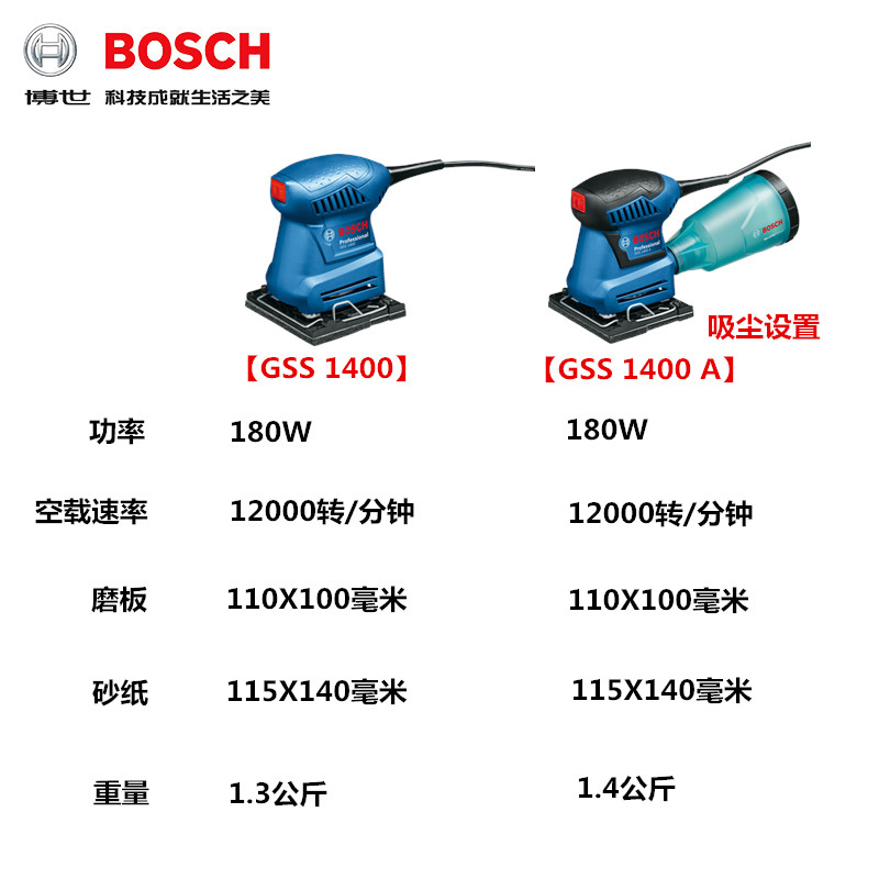 Sander GSS1400 (factory standard) Send 3 pieces of sandpaper Sander GSS1400A vacuum (with dust bag) Send 3 pieces of sandpaper sander GSS1400A vacuum