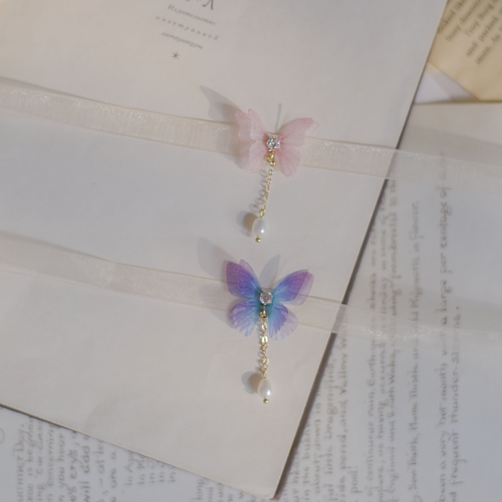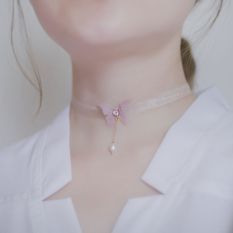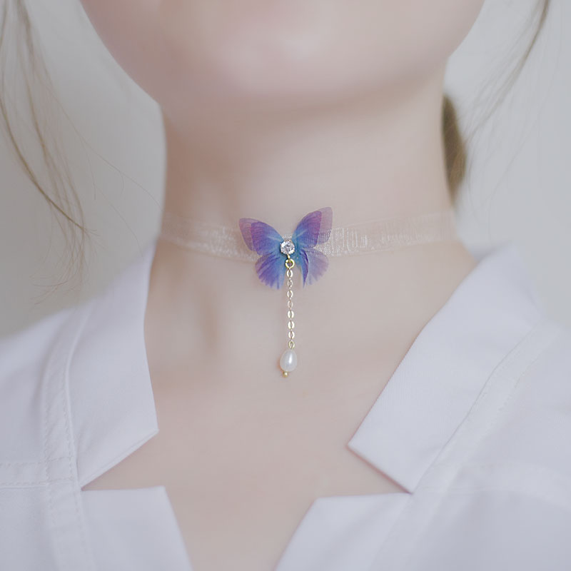 Butterfly in the dream Transparent color yarn with butterfly flash diamond fashion temperament pearl zircon choker necklace choker