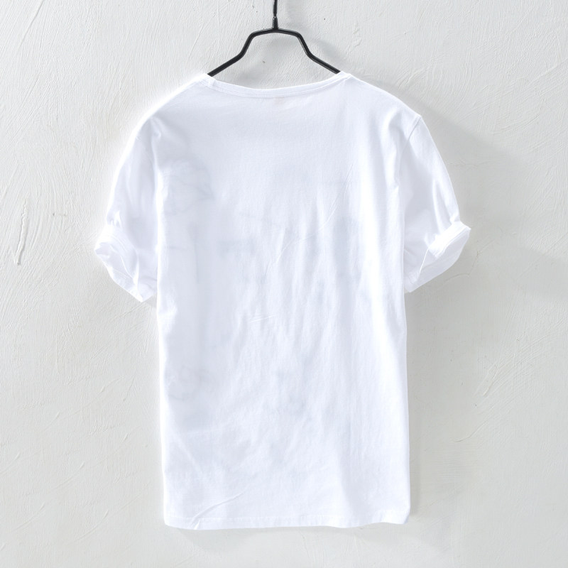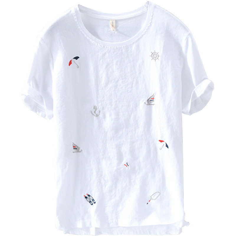 Cartoon Embroidered Round Neckline Linen Short Sleeve T-shirt Men Casual Thin style Slim Fit Childhood Splicing Cotton Linen T-Shirt Tide