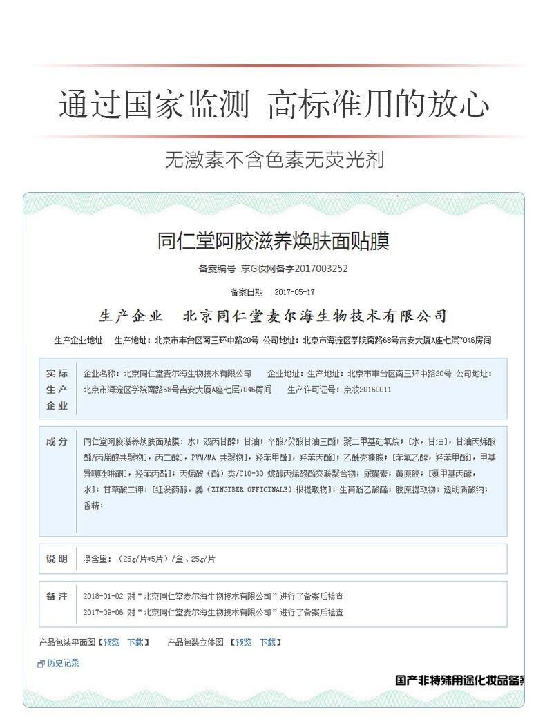 Tongrentang Ejiao Youth Rejuvenation Mask Firming and removing fine lines, anti-nasolabial lines, head-up lines, anti-wrinkle and aging