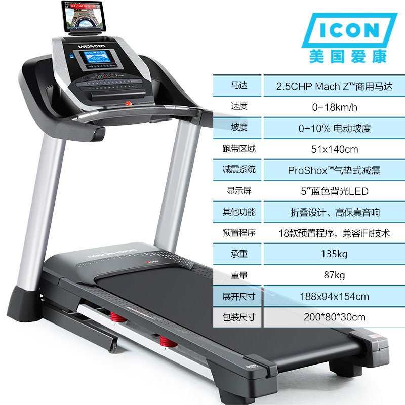 51 cm wide running belt Hydraulic folding Patented suspension damping 10% slope adjustment 18 training programs