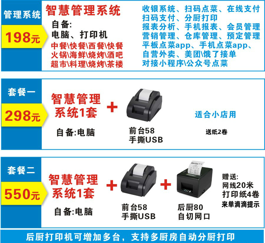 Full-featured management system set one system + 1 set of 58 printer set two system + 58 front play + 80 kitchen set three system + 80 front play + 80 kitchen beat