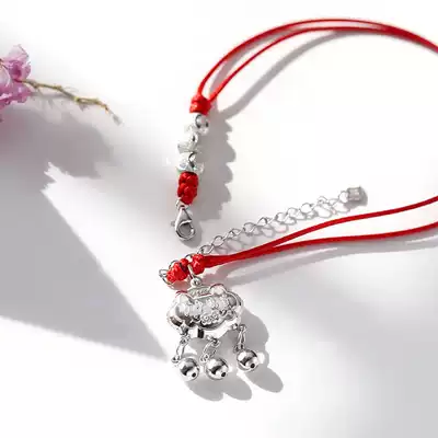 Ping An long life lock, year of life, red rope, red beads, men's ancient style bells, 999 sterling silver anklets, women's men's woven rope