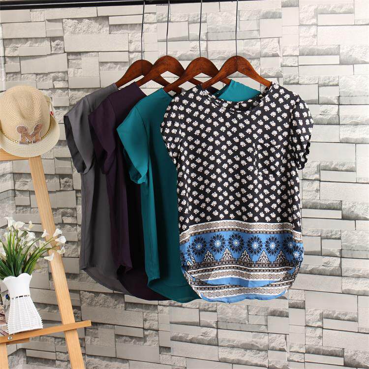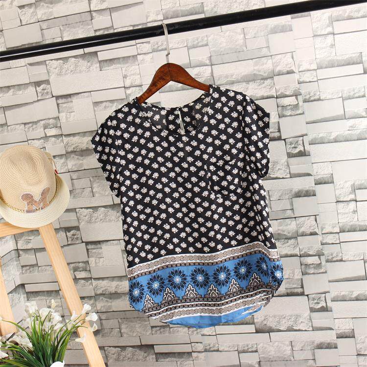Round neck summer new Korean version large size loose chiffon shirt printed short-sleeved women's top tide A7-4