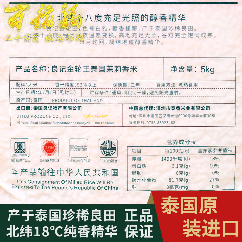 Liangji Golden Wheel King Thailand Jasmine Rice 5KG2021 Year New Rice 10 Jin Dress Thailand Original Imported Guangdong