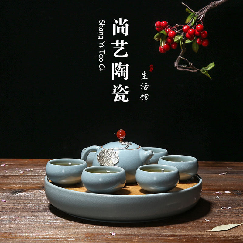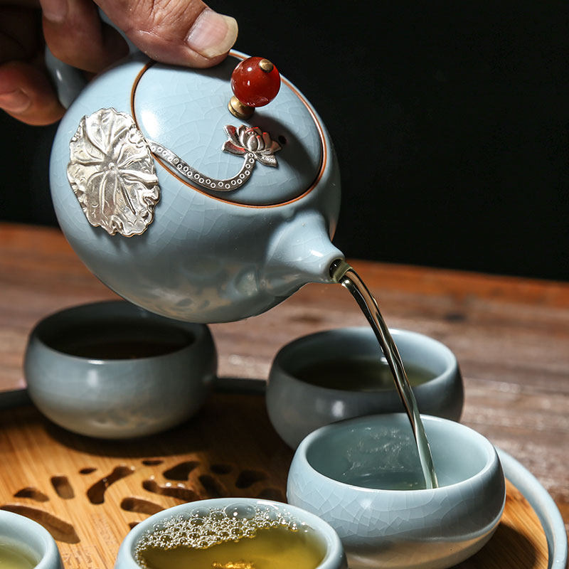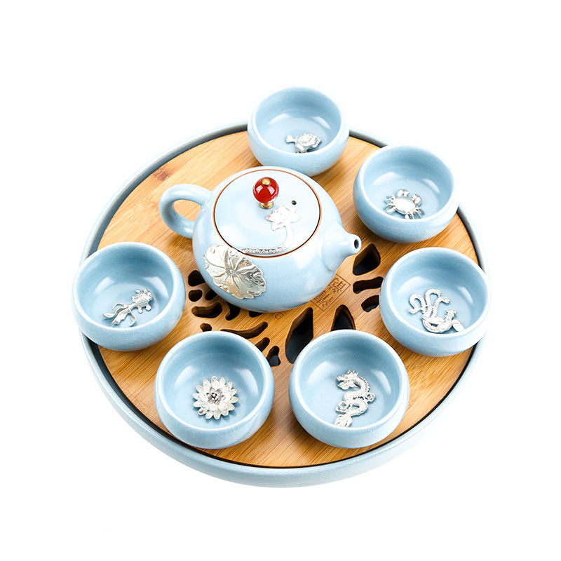 Ru kilns a pot of six cups inlaid silver with tea tray