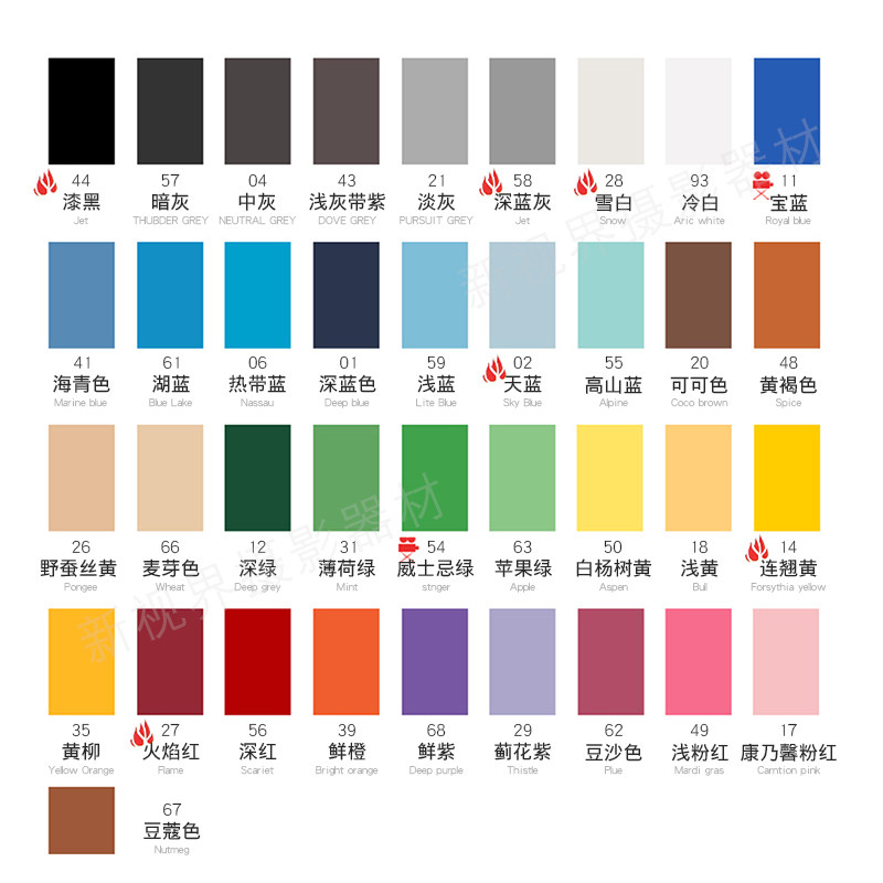 44 Painted Black 57 Dark grey 04 Number of grey 43 light grey with purple 58 Deep blue grey 21 Number of light grey 28 Snow White pure color 93 Number of cold white 56
