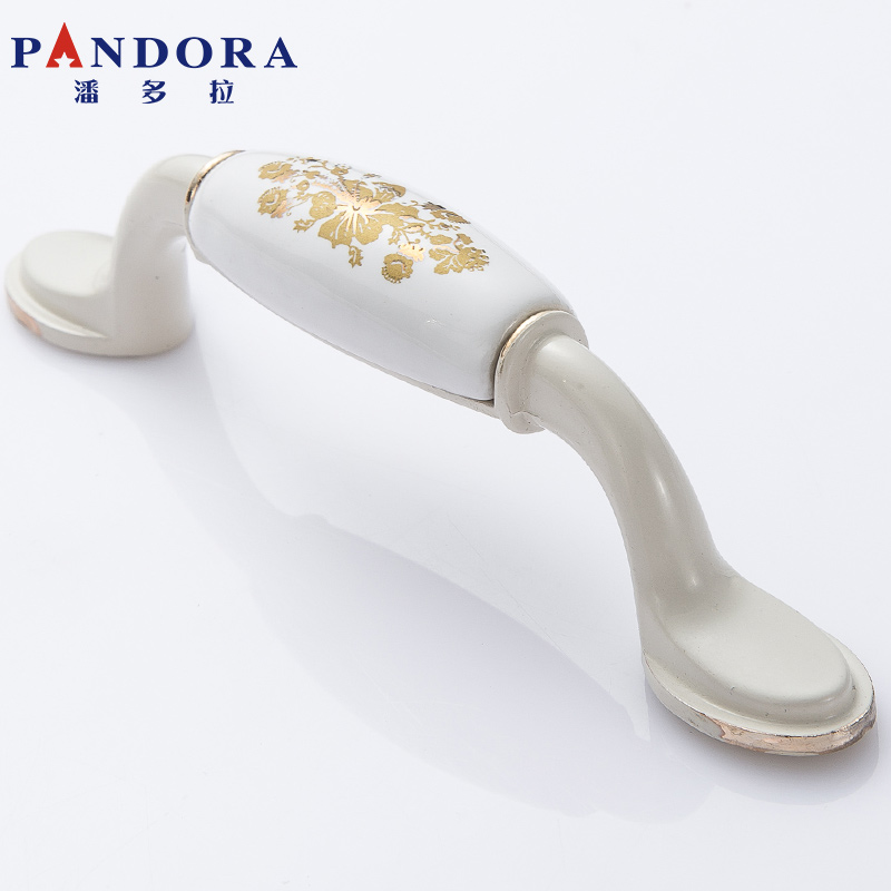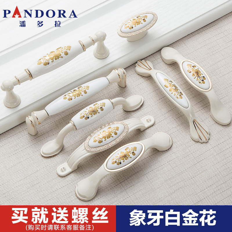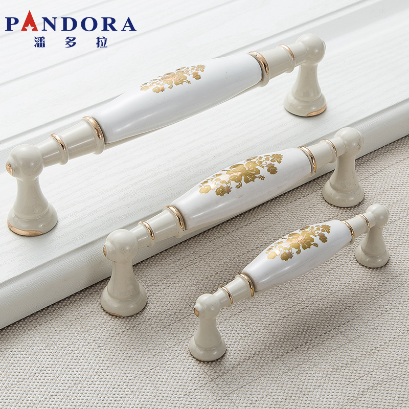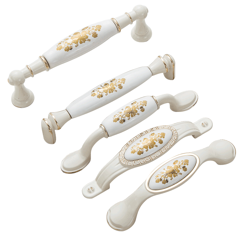 Cabinet door handle ceramic ivory white golden flower integral cabinet shoes and clothing cabinet door handle European and American rural style single hole hardware