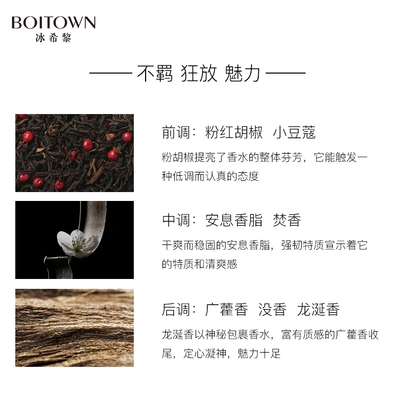 Fir, Pepper, peach, cypress, Sandalwood, Pine, ambergris, bergamot, Musk, benzoin, Rock, bluegrass, patchouli