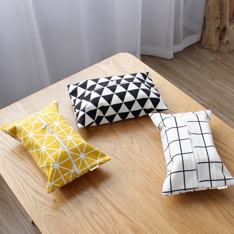 Pastoral cotton and linen tissue bag Plaid triangle fabric double layer double zipper removable toilet paper bag Household car lanyard tissue box