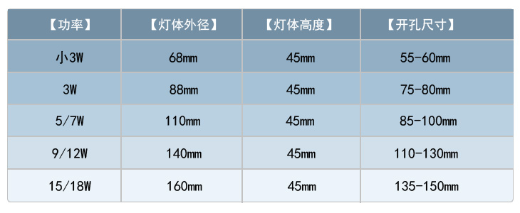 12W warm white (drilling 11-12) 9W neutral light (drilling 11-12) 3W warm white (drilling 7 5-8) small 3W positive white (drilling 5 5-6) 7W positive white (