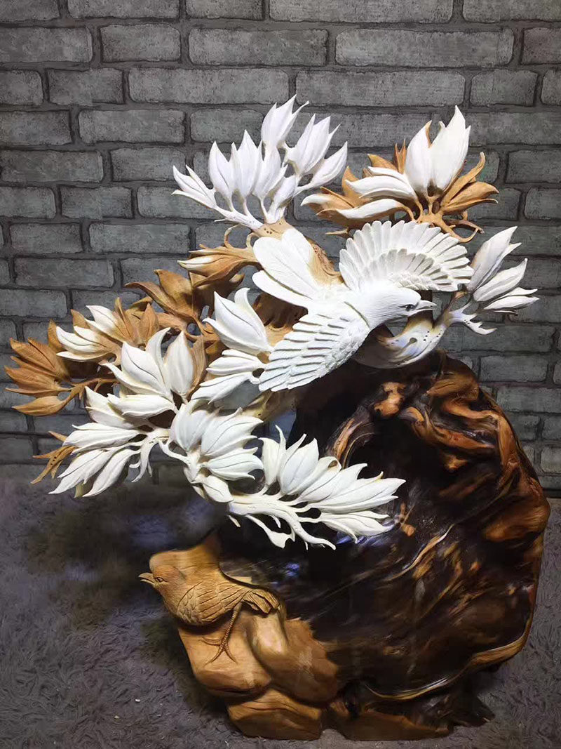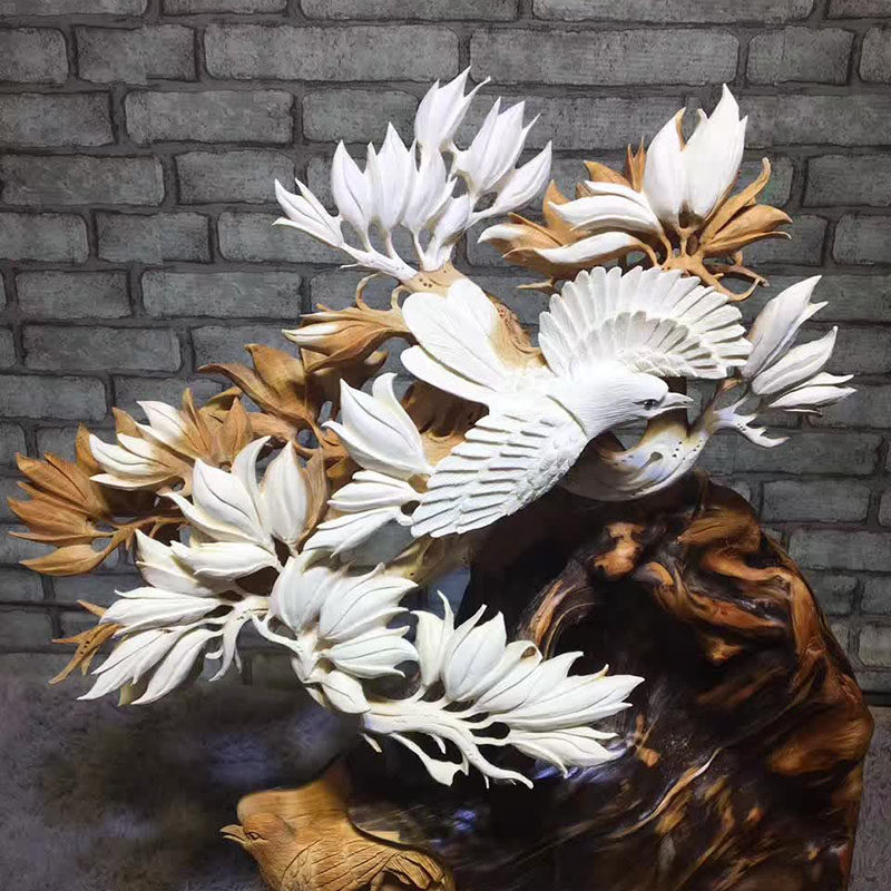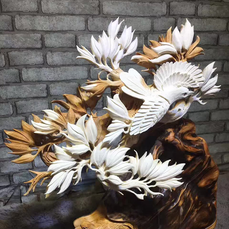 Muyugen Carving Factory Magnolia flower semi-natural aged cypress material hand-carved magpie eyebrow ornament