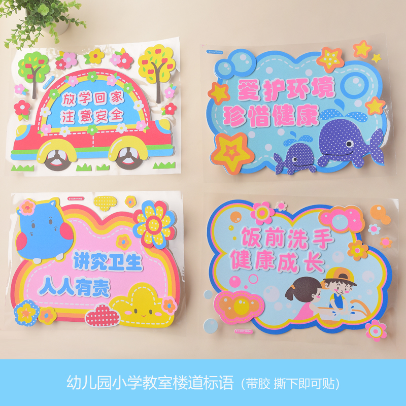 Sky blue, yellow, pink, light blue, red, lake, blue, watermelon, red, blue, purple, orange, and lotus root to maintain hygiene, save water, go up and down the stairs, walk right to the right, be diligent, exercise, and wash hands frequently.