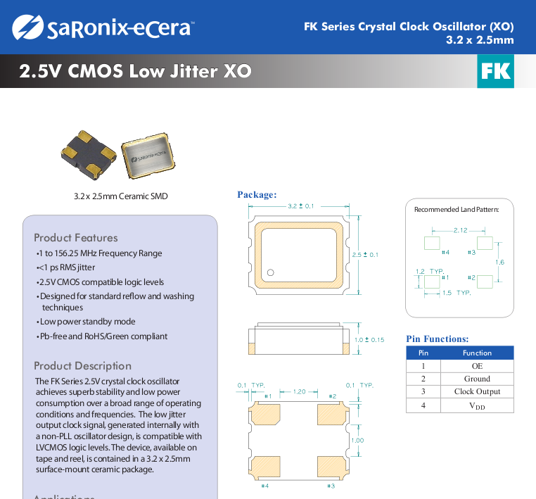 FK4000051W DIODES SARONIC ECERA ACTIVE PATCH CRYSTAL OSCILLATOR 3225 2 5V 40M