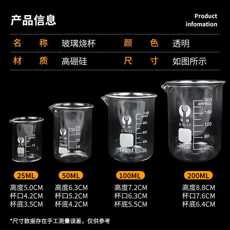 25ML beaker 1 pc 50ML beaker 1 pc 100ML beaker 1 pc 200ML beaker 1 pc