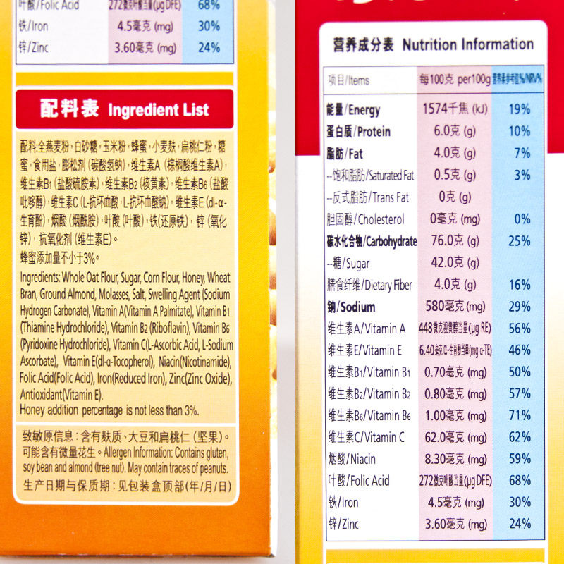 Oat flour corn flour white sugar almond malt extract edible salt calcium carbonate tricalcium phosphate reduced iron zinc oxide vitamin A Vitamin B1 vitamin B6