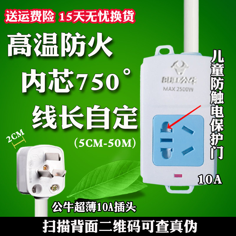 Bull socket row plug three-core long and short wire plug row wiring board three-claw plug 10 30 50 1 m 5 80 cm
