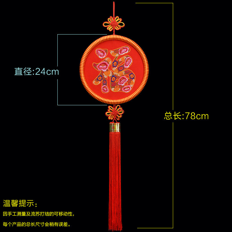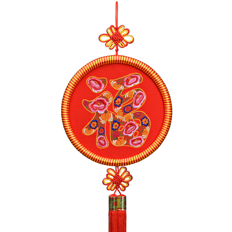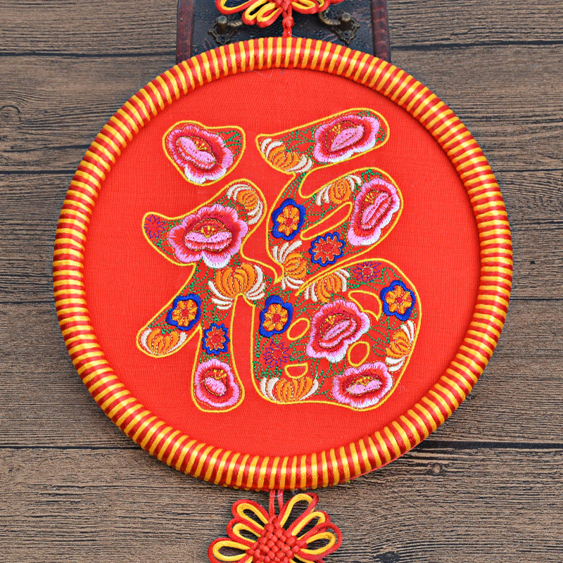 Embroidery pendant blessing round frame red fabric blessing ornament living room porch decoration Spring Festival blessing to China knot wall hanging