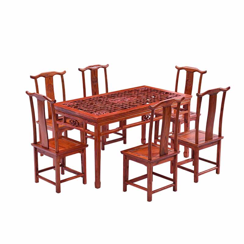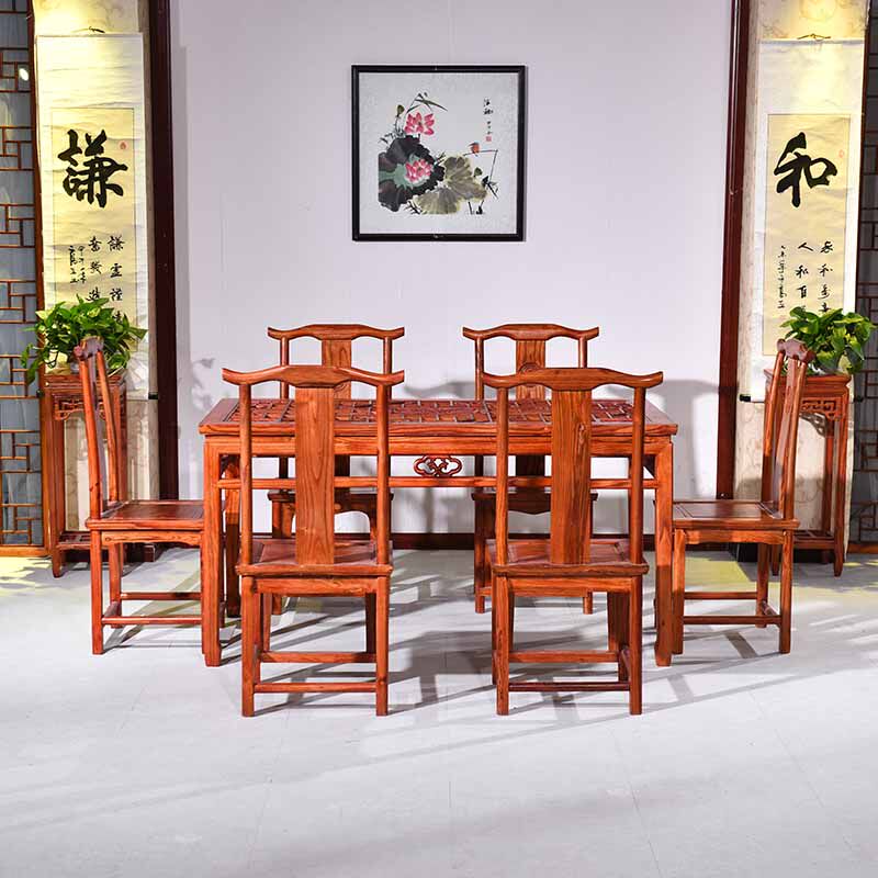 Antique glass table Chinese solid wood elm wood rectangular hollowed-out carved dining table hotel restaurant table and chairs combination