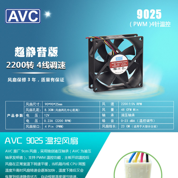 AVC ultra silent 9025 desktop computer case fan 4-pin temperature-controlled throttle 9cm power fan CPU radiator