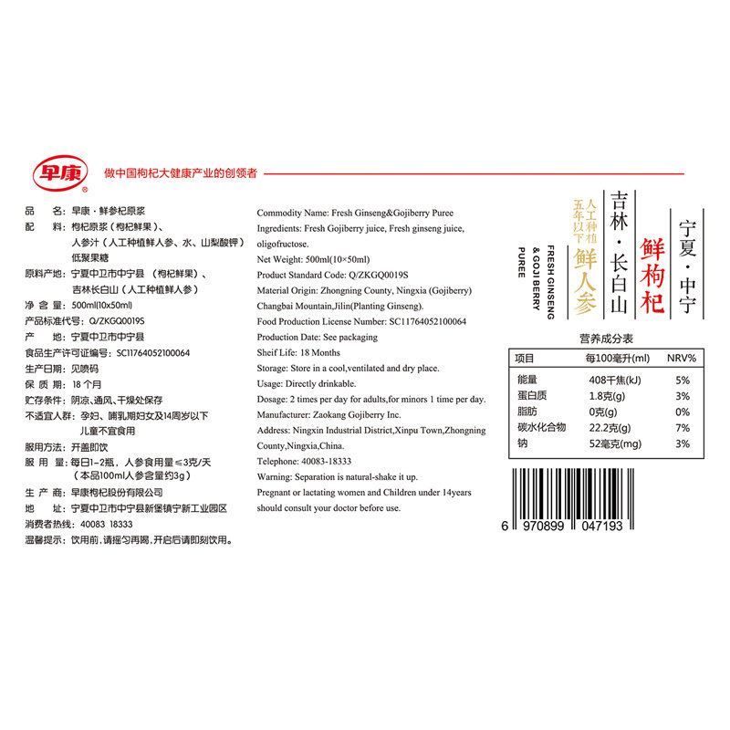 Morning Confreshmen ginseng berry raw berries long white Mountain fresh ginseng in Ningxia Zhongning medlar juice gift box 500ml