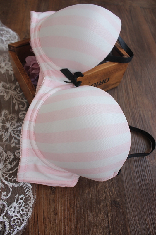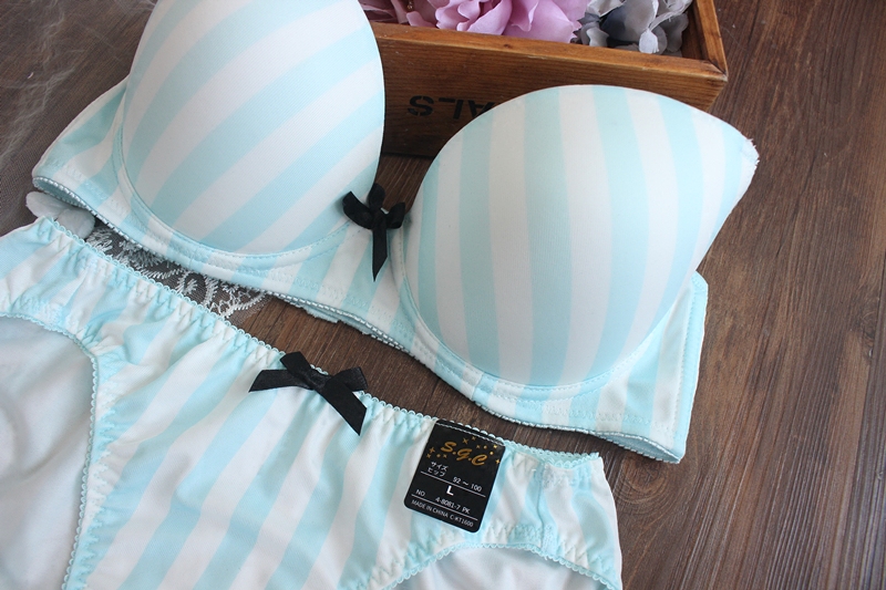 Japanese light color sweet blue and white stripes Light surface without trace pink gathering bra suit cute bra