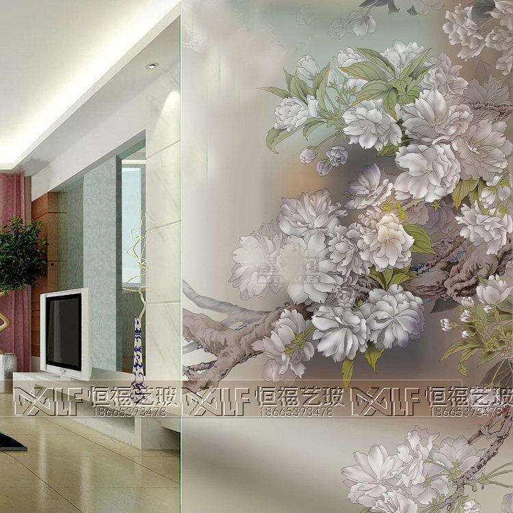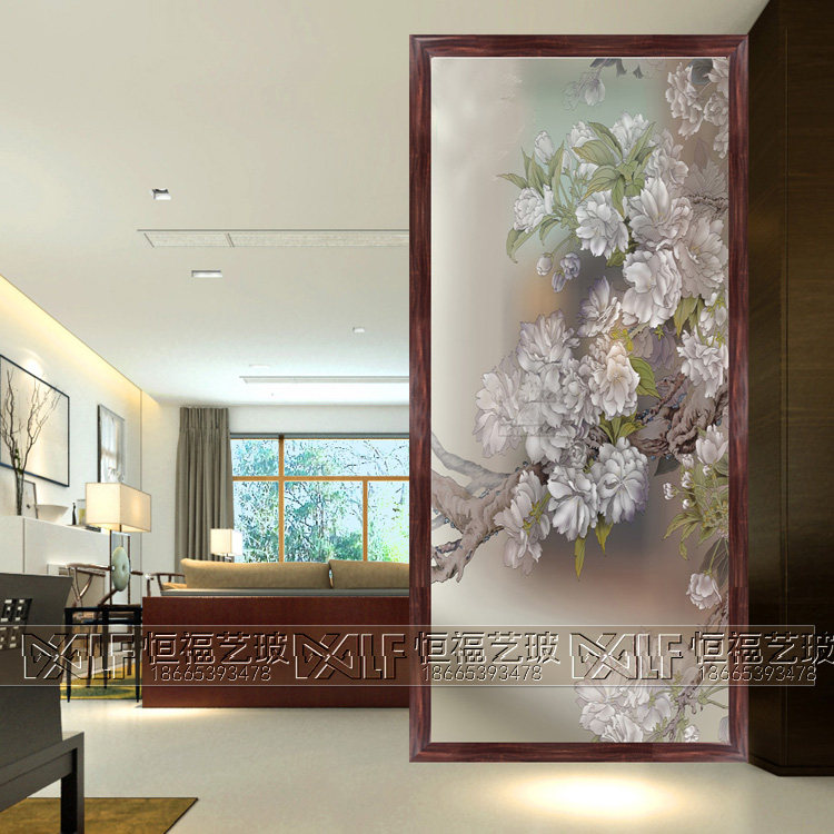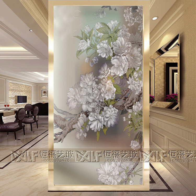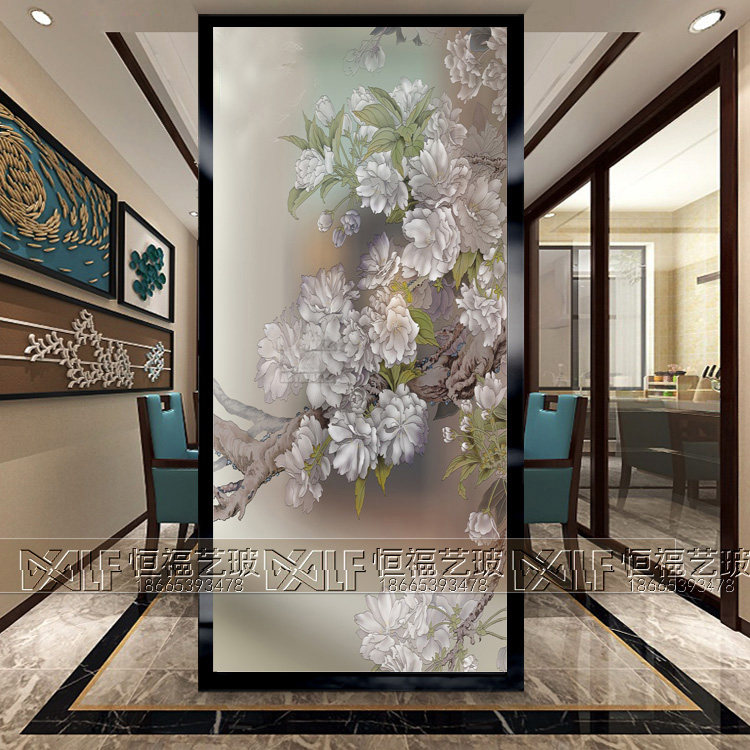 Art Glass Background Wall Partition Screen Xuanguan Living Room Modern Minimalist Carved Frosted Craftsmanship Glass Peony Flowers