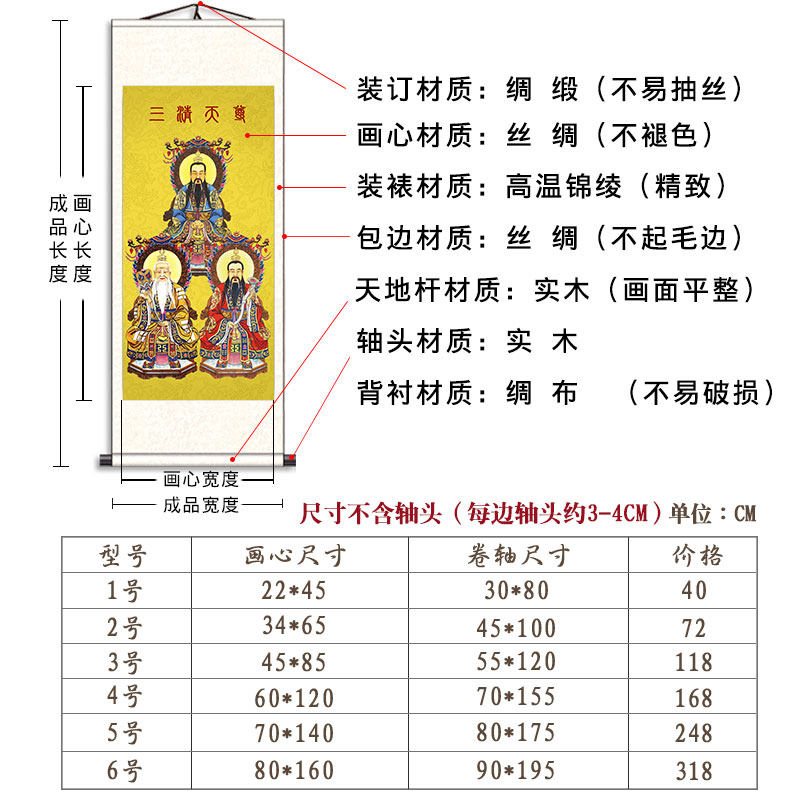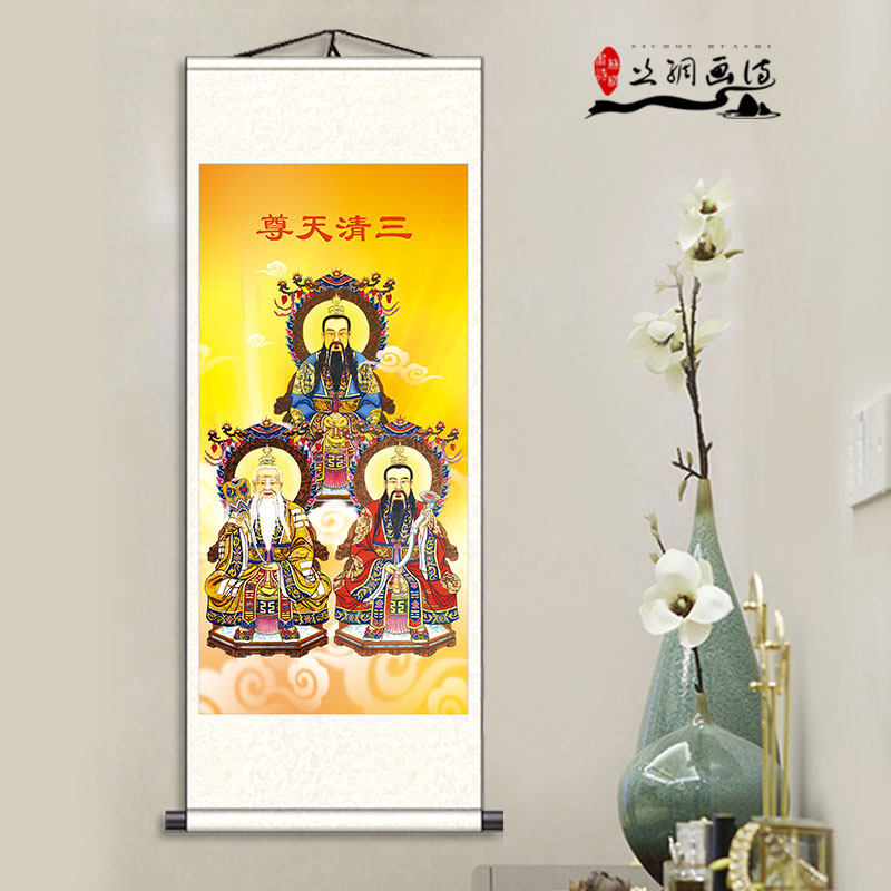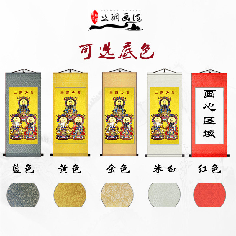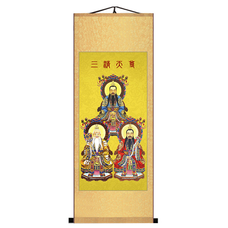 Taoism Sanqing portrait Taishang Laojun Yuan Shi Lingbao Tianzun Statue Silk scroll decorative painting Taoist teaching map
