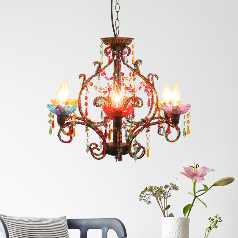 Nordic retro industrial style creative multi-head candle color beaded crystal chandelier coffee living room bar wrought iron lamp
