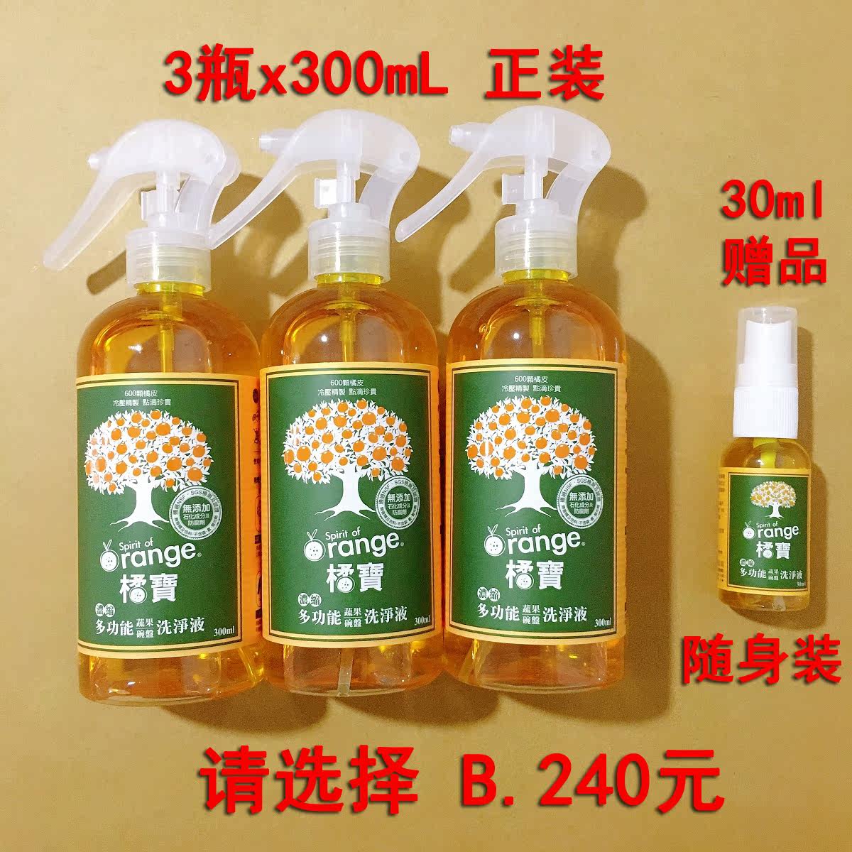 3 bottles of 240 Taiwan imported Chen Yuqing Orange Tangerine Orange Treasure Natural Washers of fruits and vegetables Fruit and vegetables Detergent Wash Essence 300ml
