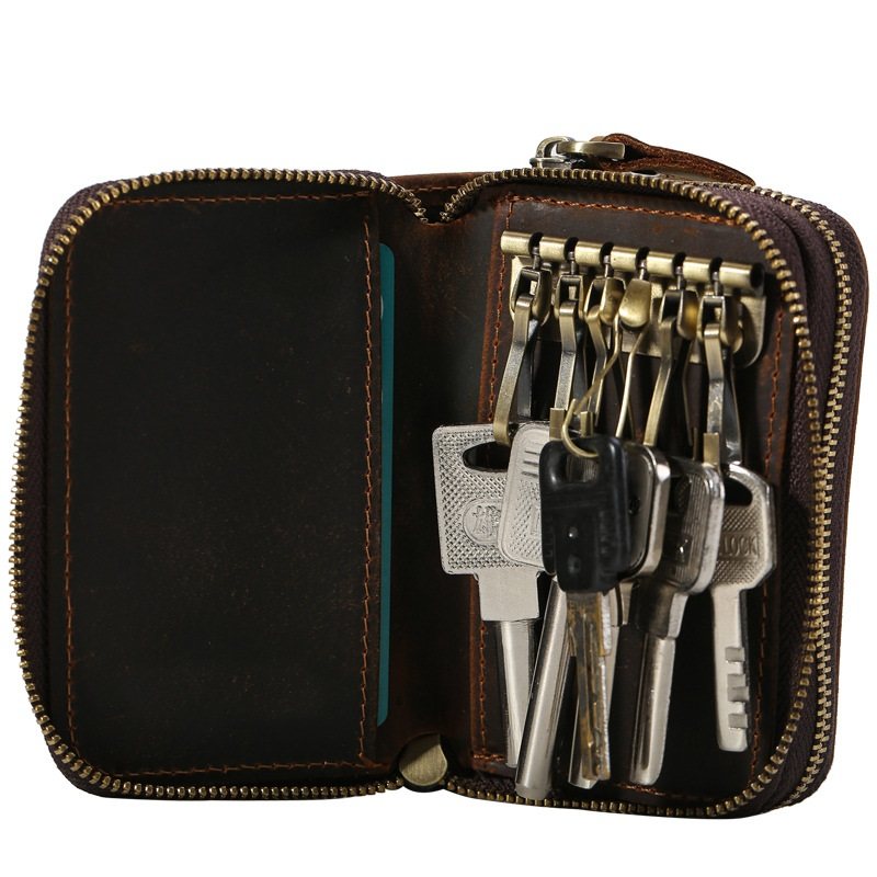 Crazy horse leather double zipper male and female key bag car handmade leather hand carry small bag large capacity leather multi-function bag