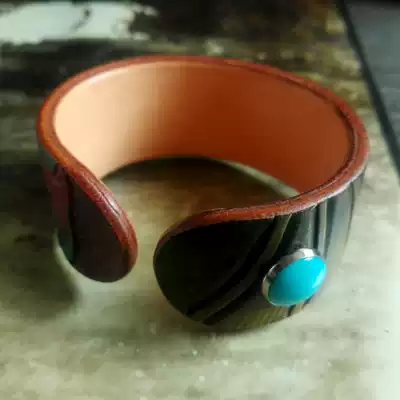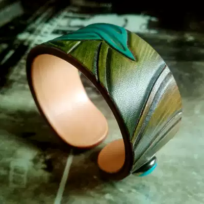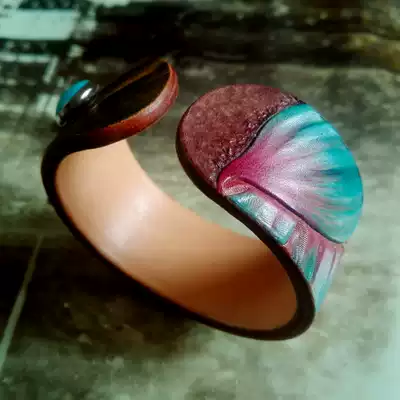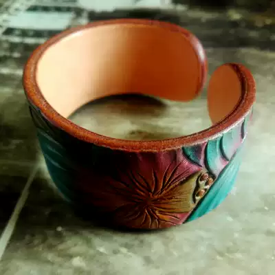 Handmade leather clothing jewelry custom leather carving painted blue lotus inlaid turquoise women's bracelet