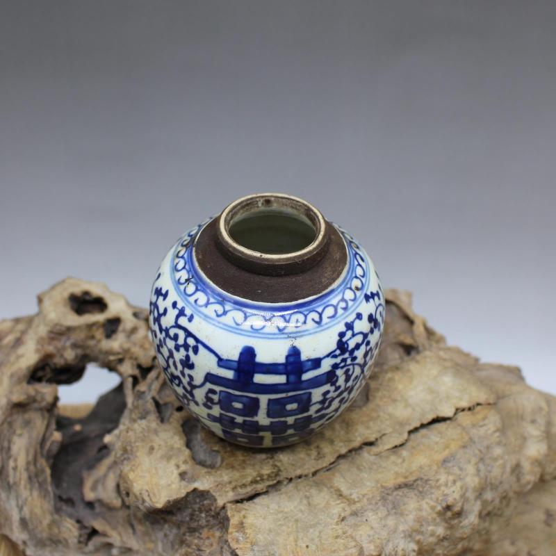 Qing Kangxi blue and white happy word pot handmade antique unearthed old goods porcelain small tea pot antique antique collection