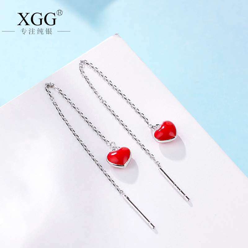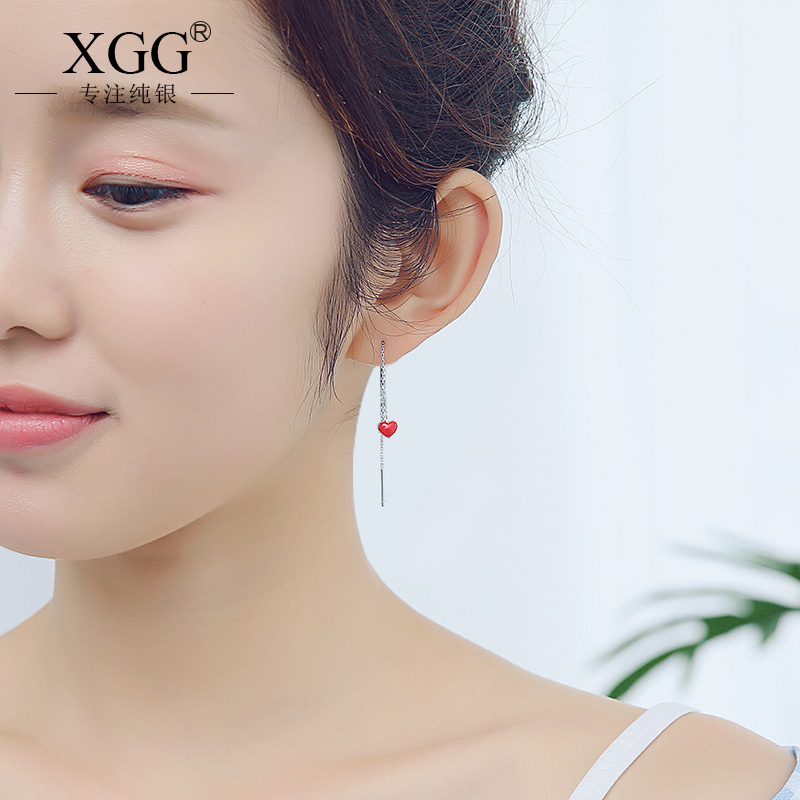 Japanese sweet and cute Korean temperament sterling silver earrings female earrings long version red love small red heart earrings personality