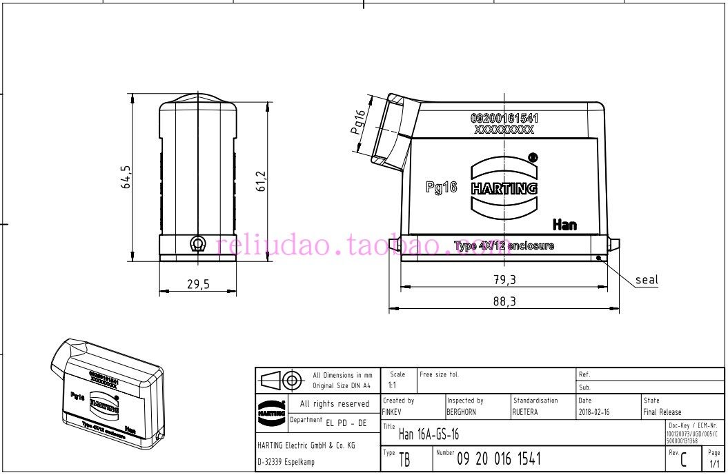 HARTING connector 09200161541 upper shell side out of HAN-16A-GS-16 original brand new