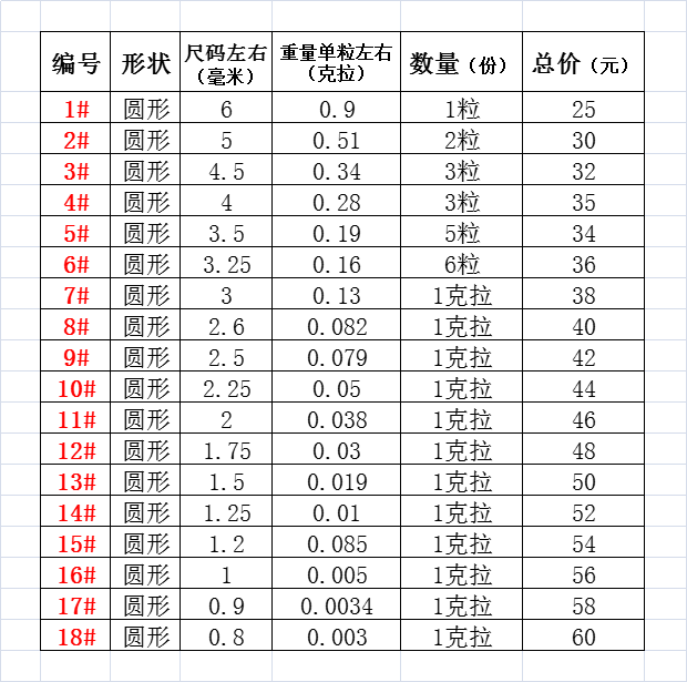 1#Round 6mm1pcs 2#Round 5mm2pcs 3#Round 4 5mm3pcs 4#Round 4mm3pcs 5#Round 3 5mm5pcs 6#Round 3 25mm6