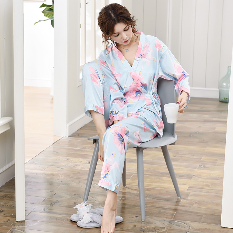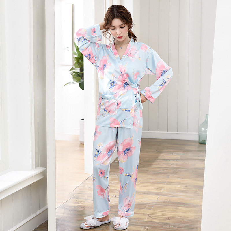 Japanese kimono pajamas women's summer ice silk long sleeve thin suit air conditioning room Japanese silk lace-up moon home clothing