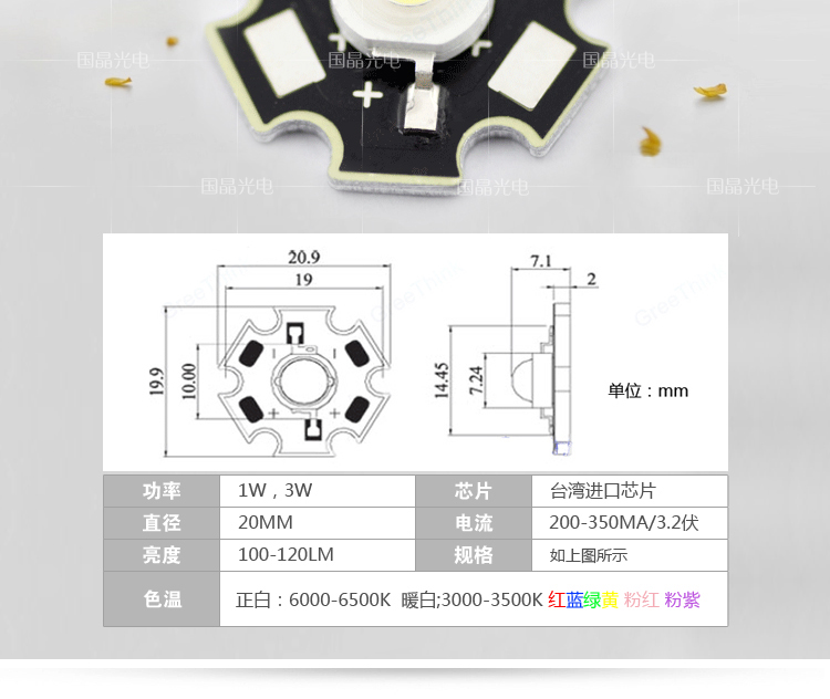 Super-bright chip high power LED light bead with wire with aluminium base plate 1W3W5W tile red green blue yellow purple white light