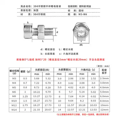 304 stainless steel hexagon socket screw M3M4M5M6 cylinder head Cup head bolt Lenger screw nut set