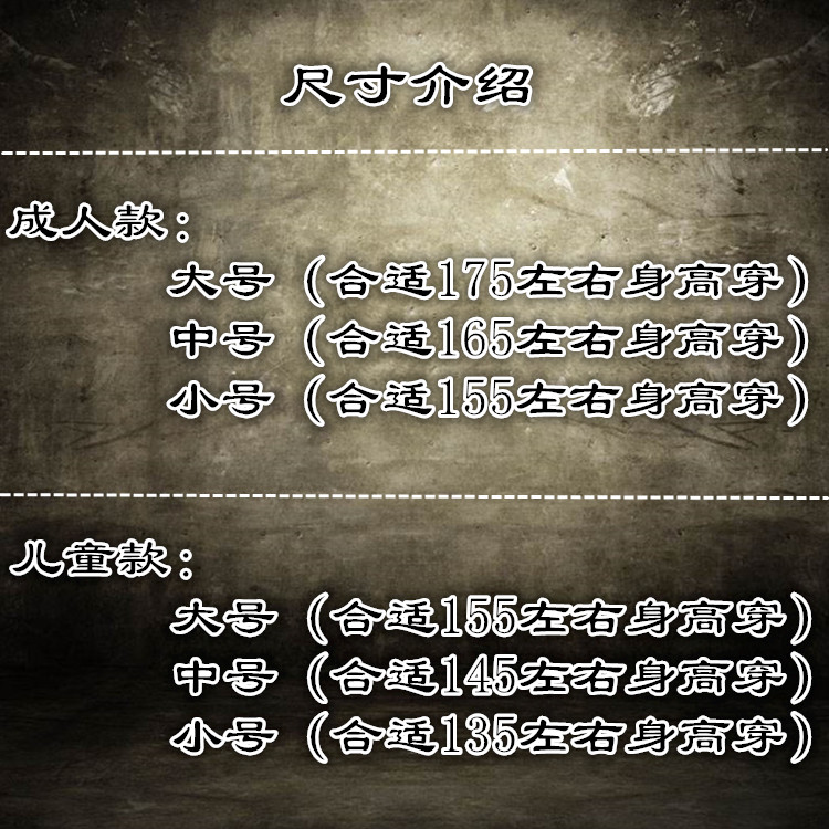 Adult size (about 180 height wearing) Adult midsize (about 170 height wearing) Adult trumpet (about 160 height wearing) Children's large number (150-160 height wearing) Children's size (150-160 height wearing) Children