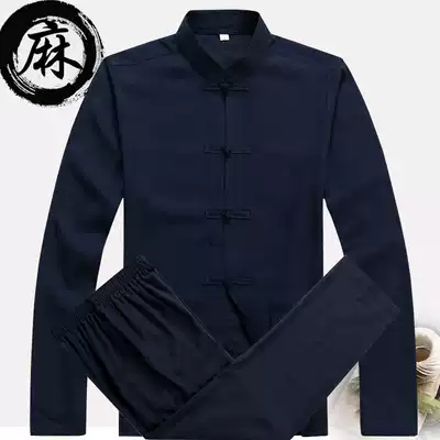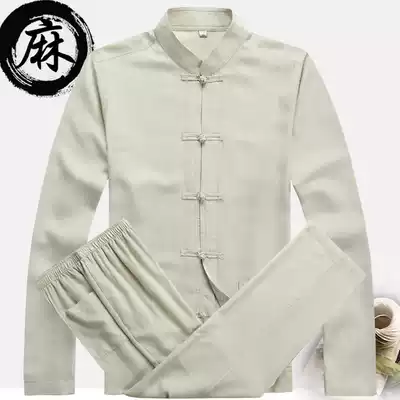 Spring and summer cotton linen men long sleeve Tang suit set middle-aged and elderly linen stand neck shirt Chinese style father grandfather dress