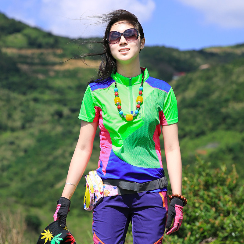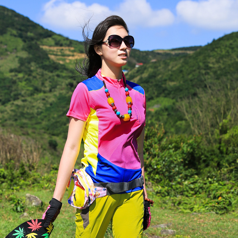 Outdoor speed dry dress girl short sleeve T-shirt splicing elasticity repair slim wet absorption sweat fast dry clothes walking