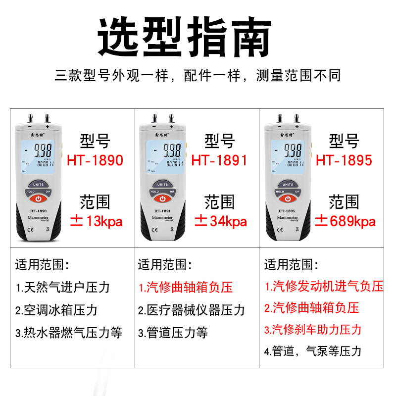 1890 (±13Kpa) Suitable natural gas Air conditioning pressure 1891 (±34Kpa) Measuring crankcase negative pressure + 1 black head 1895 (±689Kpa) Measuring crankcase and engine negative pressure + 1 blackhead 1890 (±13Kpa) Suitable natural gas Air conditioning pressure + joint + 1 meter hose 1891 (±34Kpa) Measuring crankcase negative pressure + joint + 1 meter hose 1895 (±689Kpa) measuring crankcase and engine negative pressure + joint + 1 meter hose Tips