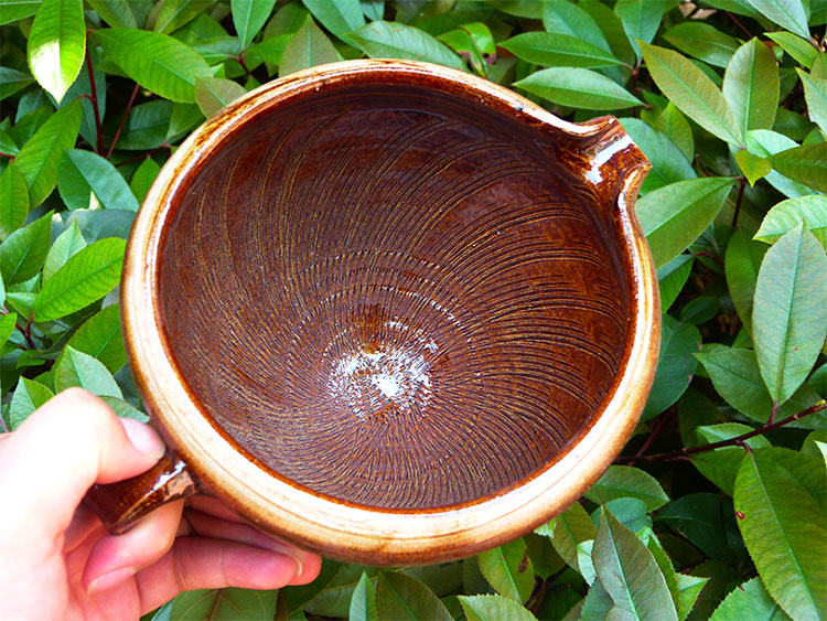 The coarse pottery of the bowl of the garlic mortar and the stone mortar.: